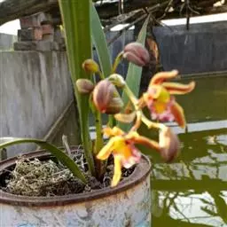 上盆(或翻盆)时间一般在春季3-4月或秋季10-11月。花盆以口小、盆深、底孔大的为佳。新从山上挖来的野生苗需理植于瓦盆(泥盆)中,这样兰花泥易干,通气性好.容易发根;2-3年后方可换人紫砂盆或瓷盆。兰花种植(在盆中)的方法与一般花卉不同,尤其是名种兰花,翻种移盆必须洗根。方法足将根浸入清水中,用旧牙刷或毛笔轻轻洗刷,切勿用力过大伤根;用剪刀将残叶、黄叶、断裂根、发黑腐烂根剪去,注意勿伤幼芽。然后将处理好的植株放在阴凉通风处晾干,待根部发白并显细小皱纹柔软时,再植入盆中。 方法一 准备好兰盆及植料后,将兰株倒拿(根在上,叶在下)放于水龙头下以慢水冲洗,但水压切忌过强,以免伤兰根及叶子。用拇指和食指抓住兰头,小指抵住盆缘,用竹筷将根固定,当放入盆内时,尽量不要让根接触到盆壁。将豆粒大的混合石砾倒入盆底至三分之一处。然后倒入中粒植料至五分之四处,填实和尽量不要留下空间。将竹筷拔出,并摇实盆中植料。填实植料后,再用大粒植料埴入至距盆缘1.5厘米处。最后再倒入豆粒大植料,以将假鳞茎全部埋入土中为度,然后充分摇实。用压土工具轻压植料,并将表面弄平。种植完毕后,植料在盆中以中央稍高为好。 方法二 要注意盆底排水,泥盆用碎瓦填,紫砂盆必须用穿孔尼龙纱罩住盆底。植前先在盆内铺上粗石子,占盆深2/5左右,粗石培养土,厚3-5厘米,然后放入兰草。上盆时注意根部要自展,不能卷曲。种植名种兰草时一定要将老草靠边,新草放在中心,这样再发新草就有余地。种植时,左手握持兰草,右手加泥(要防止泥土贯入叶心),再将兰株稍稍提起,使根自然舒展。然后边加土边摇盆,使土与根紧密接触。再用手将茎部四周的泥土按紧,最后使盆面略显馒头状(即中间四周略低)。上面铺覆一层青苔或细石子,这样盆土不易板结并可减少水分蒸发。上完盆,立即浇水。第一次浇水水量要充足。最后将兰盆放置阴处。一个月内不宜直接晒太阳,并控制浇水,不宜太湿,以后放置地点宣选择在半阴半阳、通风透气,早上照到太阳的地方。