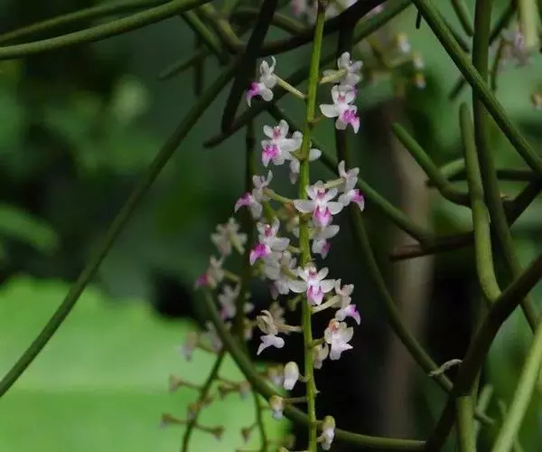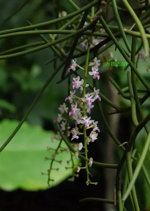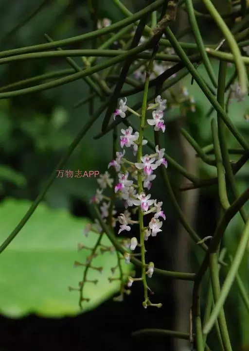 红花隔距兰 Garay):植株通常悬垂。茎细圆柱形,长达70厘米,粗3-4毫米,分枝或不分枝,…