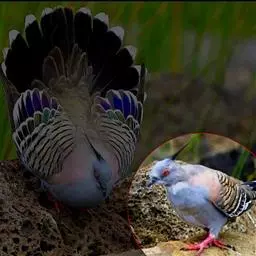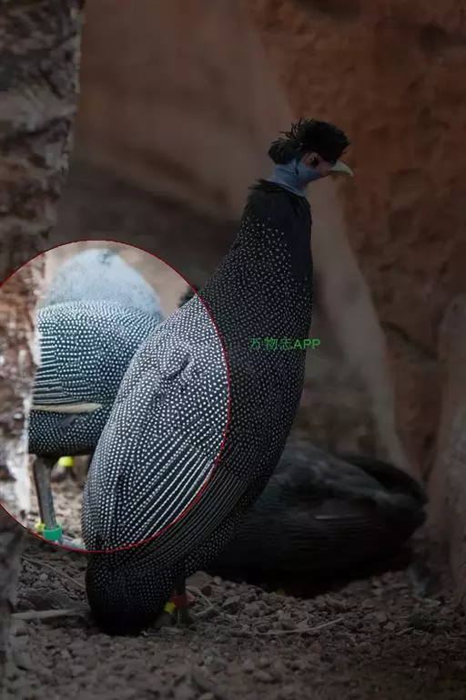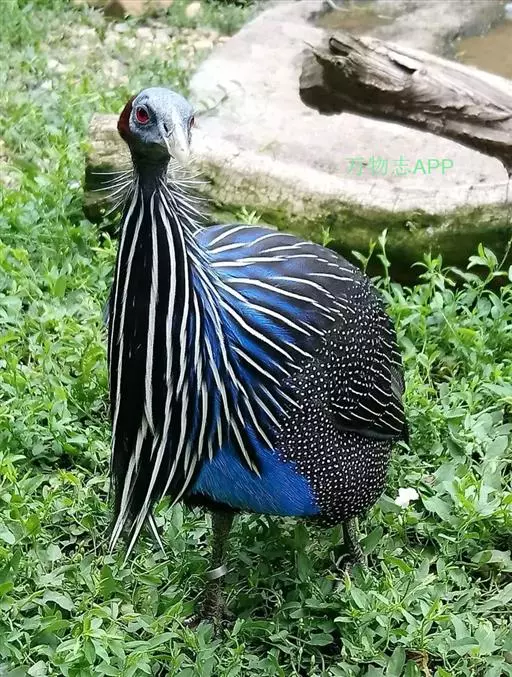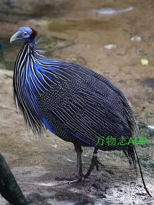 珠鸡又叫珍珠鸡、普通珠鸡。体长72—220厘米,体重1590—2725克。雄鸟头顶和羽冠黑色。裸露的脸部为蓝灰色。体羽主要为暗褐色,有皮黄色和暗褐红色的斑纹。翅膀和尾羽上有白斑和呈灰绿色、紫色和皮黄色虹彩的眼状斑,在内侧飞羽上排成一列,外圈为黑色及淡皮黄色。雌鸟头顶为黑色并有棕褐色和皮黄色羽缘,冠羽为暗灰色。裸露的脸部为蓝灰色。后头为栗褐红色。体羽有黑色杂斑和条纹,以及褐红色、栗色和皮黄色的虫蠹状斑纹。虹膜褐色;嘴浅蓝色或白色;腿、脚近红色。