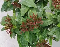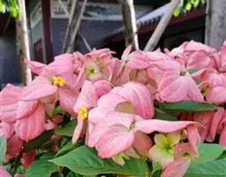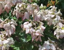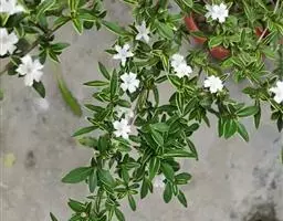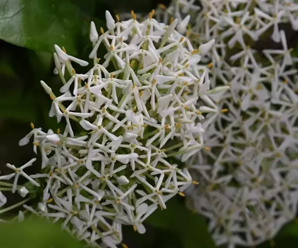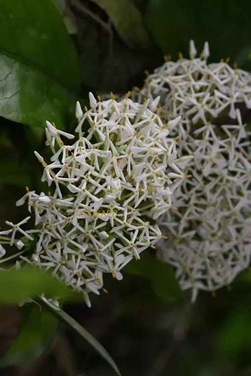 花: 3歧伞房聚伞花序长达7厘米,花序梗长约4厘米。花芳香,花梗长1-2毫米;有苞片和小苞片;萼筒长约1.5毫米,花萼裂片与萼筒等长或略短;花冠白色,冠筒长2.5-3.5厘米,花冠裂片长圆形,长6-7毫米,花药伸出。