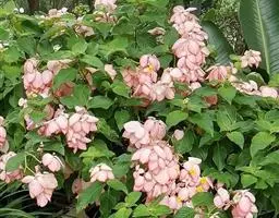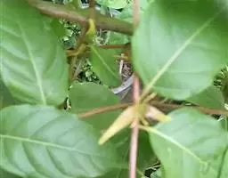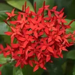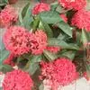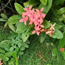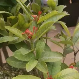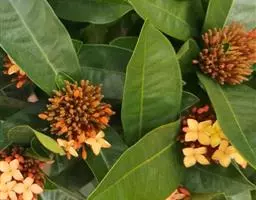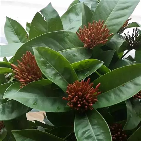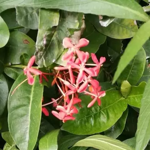 海南龙船花 叶: 叶纸质,长圆形,长5-14厘米,宽2-5厘米,先端钝圆,基部楔形或稍圆,侧脉8-10对,近叶缘连成边脉;叶柄长3-6毫米,托叶卵形,长0.4-1厘米,先端长渐尖,渐尖部分长3-4毫米。