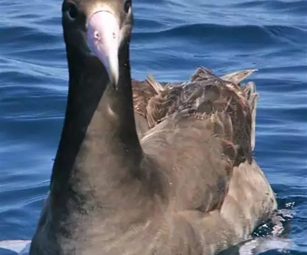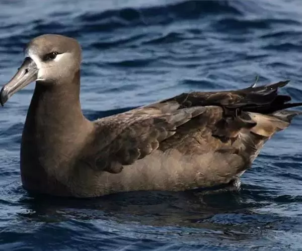 黑脚信天翁上体黑褐色,部分尾上覆羽白色,下体灰色,往腹中部逐渐变淡。尾下覆羽亦有部分为白色。嘴基周围白色,前额灰色,眼下和经过眼区有白色横斑。颊前部和颏白色,颊后部、喉和耳区灰色,前颈灰褐色。飞羽、翅覆羽和尾羽黑褐色,略较上体为暗。体羽厚而密,紧覆于身上。翅尖长。初级飞羽11枚,第一枚退化,第二枚最长,第十一枚最短。次级飞羽37枚,非常短。肩羽非常长,尾短而稍圆,尾羽12枚。嘴强而侧扁、长度中等,几和头等长。脚强而短,跗蹠左右侧扁,具网状鳞,后趾匿藏于皮下。