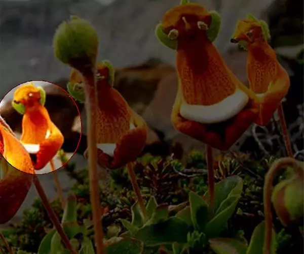 叶片卵形对生。花形别致,花冠二唇状,上唇瓣直立较小,下唇瓣膨大似蒲包状,中间形成空室,柱头着生在两个囊状物之间。
