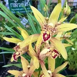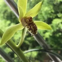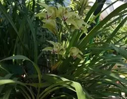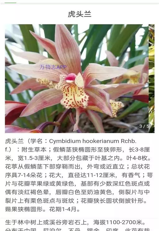 虎头兰(学名:Cymbidium hookerianum Rchb. f.):附生草本;假鳞茎狭椭圆形至狭卵形,长3-8厘米,宽1.5-3厘米,大部分包藏于叶基之内。叶4-8枚。花葶从假鳞茎下部穿鞘而出,外弯或近直立;总状花序具7-14朵花;花大,直径达11-12厘米,有香气;萼片与花瓣苹果绿或黄绿色,基部有少数深红色斑点或偶有淡红褐色晕,唇瓣白色至奶油黄色,侧裂片与中裂片上有栗色斑点与斑纹;花瓣狭长圆状倒披针形。蒴果狭椭圆形。花期1-4月。