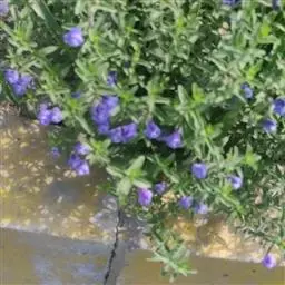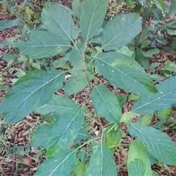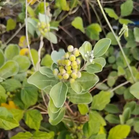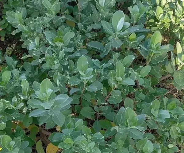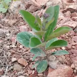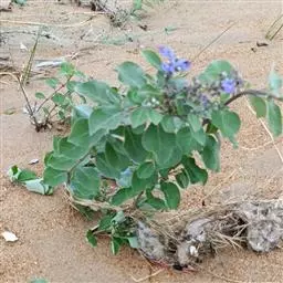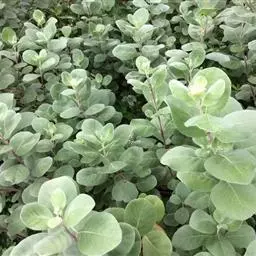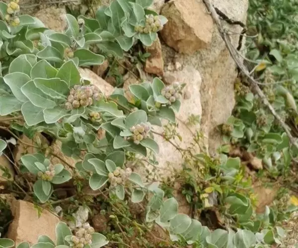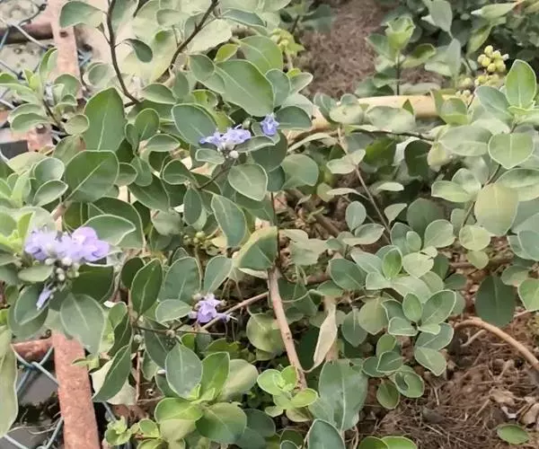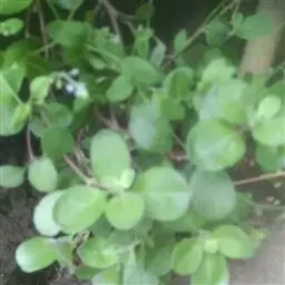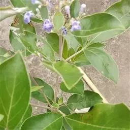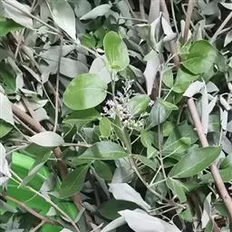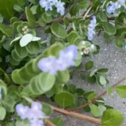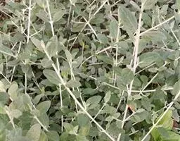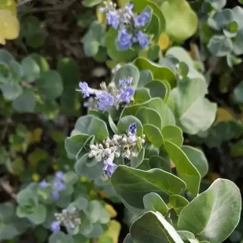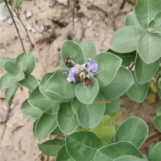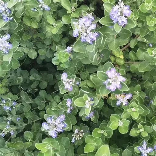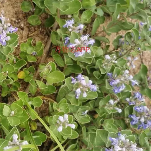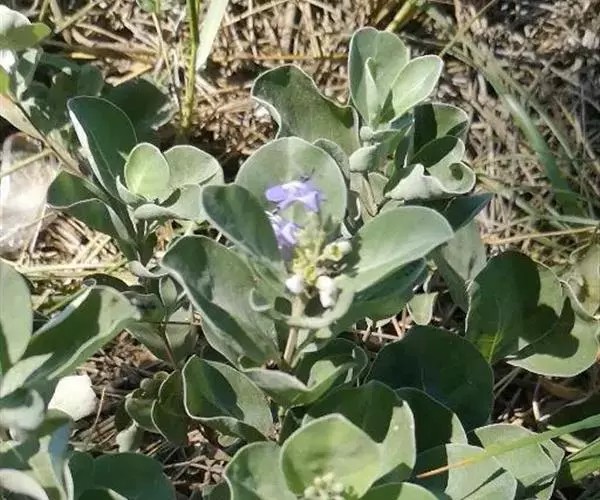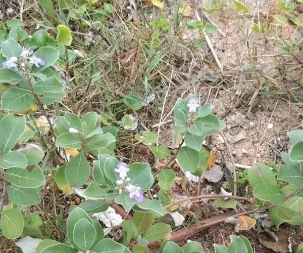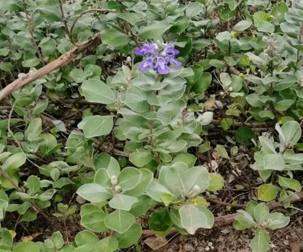单叶蔓荆 落叶灌木,罕为小乔木,高1.5-5米,有香味;小枝四棱形,密生细柔毛。茎匍匐,节处常生不定根。单叶对生,叶片倒卵形或近圆形,顶端通常钝圆或有短尖头,基部楔形,全缘,长2.5-5厘米,宽1.5-3厘米。表面绿色,无毛或被微柔毛,背面密被灰白色绒毛,侧脉约8对,两面稍隆起,小叶无柄或有时中间小叶基部下延成短柄。