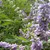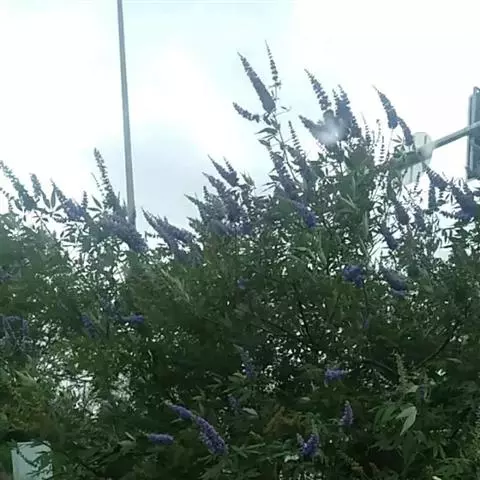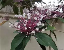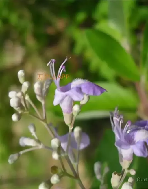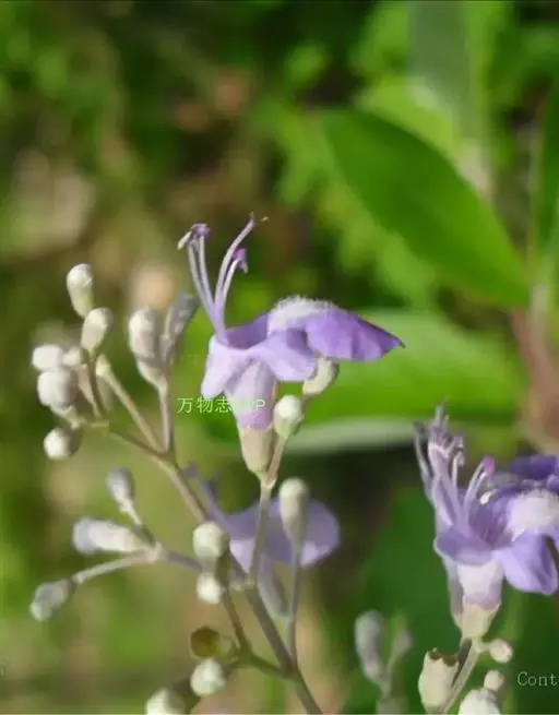 圆锥花序顶生,长3-15厘米,花序梗密被灰白色绒毛;花萼钟形,顶端5浅裂,外面有绒毛;花冠淡紫色或蓝紫色,长6-10毫米,外面及喉部有毛,花冠管内有较密的长柔毛,顶端5裂,二唇形,下唇中间裂片较大;雄蕊4,伸出花冠外;子房无毛,密生腺点;花柱无毛,柱头2裂。核果近圆形,径约5毫米,成熟时黑色;果萼宿存,外被灰白色绒毛。花期7-8月,果期8-10月。