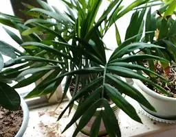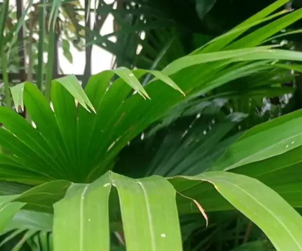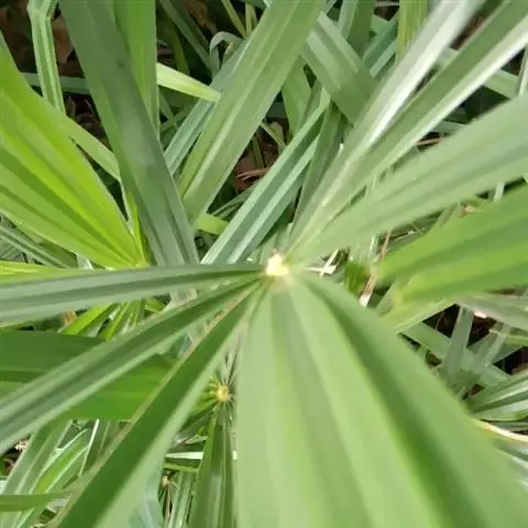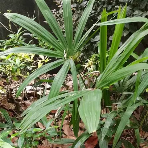 细叶棕竹,灌木,茎细如竹,多数聚生,有网状叶鞘。叶半圆形,掌状深裂,裂片狭长,阔线形,软垂,裂片7…