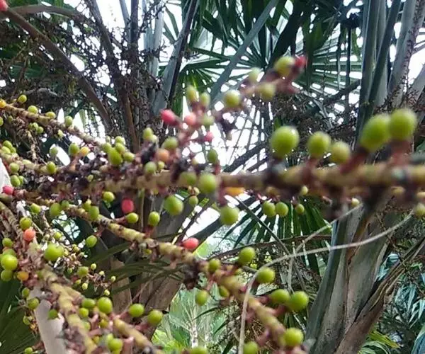 常绿丛生灌木至小乔木状,高3-8m,茎直立、粗壮。叶团扇形,宽50-80厘米,掌状深裂,裂片14-16,线形,先端渐尖,不分裂,或者为2浅裂;叶柄上面具沟槽,无剌。肉穗花序腋生,多分枝,呈圆锥花序式,主轴和分枝上有的管状总苞和漏斗状的小苞片;花两性,子房由2枚合生心皮组成,长圆形,花柱短,柱头2枚。浆果球形,直径约1.5厘米,成熟时呈黄色至红色,外果皮薄革质,中果皮内质;种子球形,径约1厘米,灰白色,具有观赏价值。