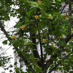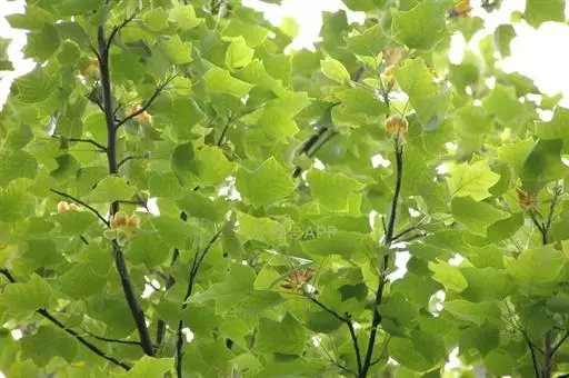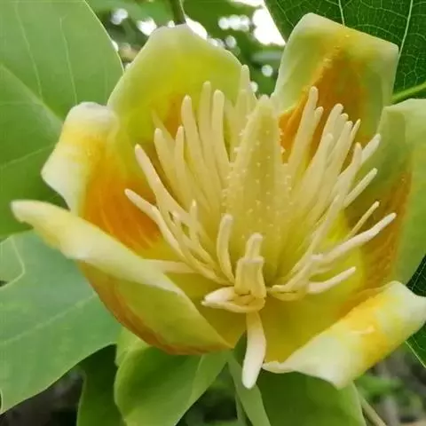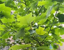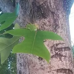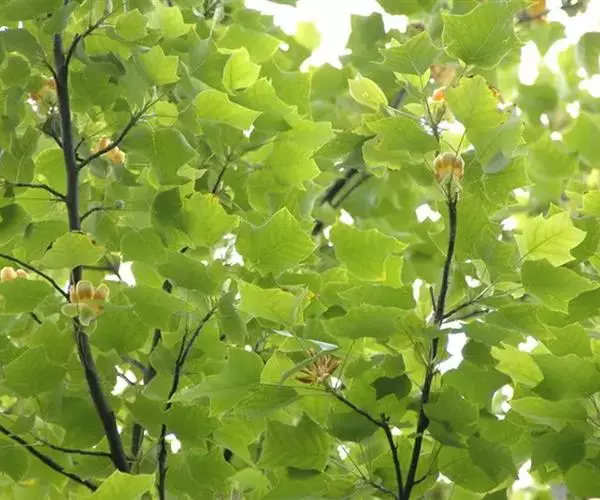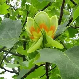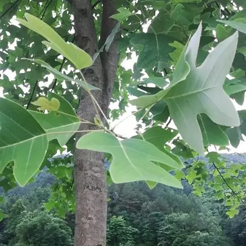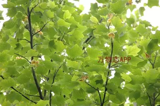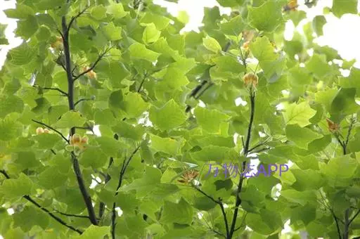 落叶乔木,高达60米,主干通直,叶形似马褂,长7-12厘米,先端略凹,具4裂片,两中裂片长小于宽,近似北美鹅掌楸,叶背面白粉点小,近似中国鹅掌楸。小枝紫褐色,树皮褐色,树皮浅纵裂。花期5-6月,花较大,黄色,具清香,单生枝顶,萼片3,花瓣6,形似郁金香。聚合果纺锤形,先端钝或尖,由多个顶端具1.5-3厘米长翅的小坚果组成,10月成熟,自花托脱落。 [1-2] 杂种鹅掌楸