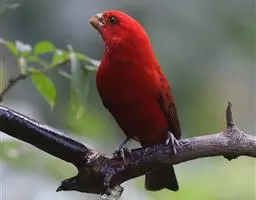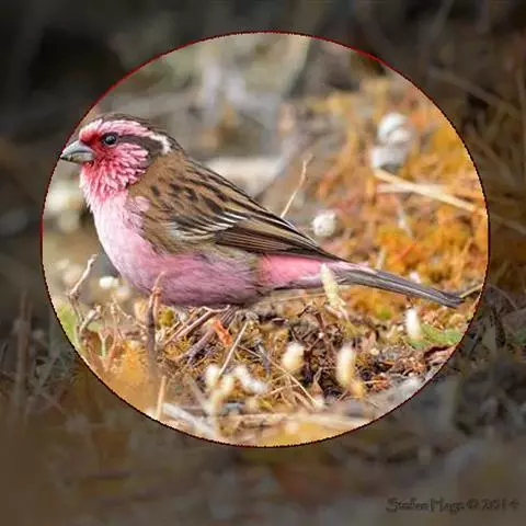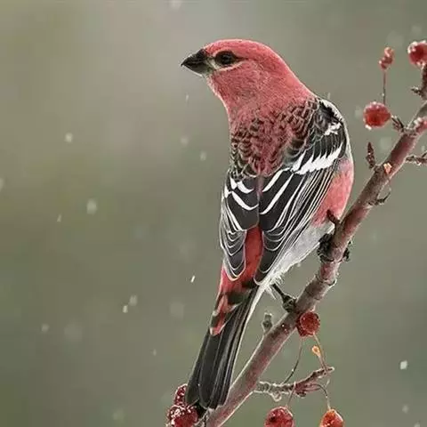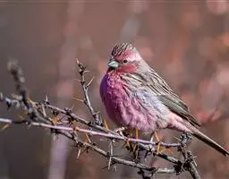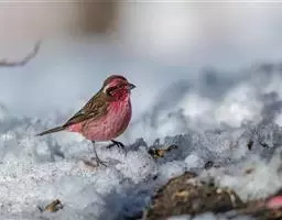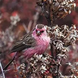 藏朱雀:全长约17-18厘米。雄鸟头部深红色具光辉,喉部暗红色具白色点斑;背部灰白色,各羽具玫瑰红…