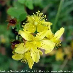 贯叶连翘(学名:Hypericum perforatum L.)是藤黄科,金丝桃属多年生草本植物,高可达厘米,全体无毛。茎直立,多分枝,叶无柄,叶片椭圆形至线形,先端钝形,边缘全缘,背卷,上面绿色,下面白绿色,脉网稀疏,不明显。聚伞花序,生于茎及分枝顶端,苞片及小苞片线形,萼片长圆形或披针形,花瓣黄色,长圆形或长圆状椭圆形,两侧不相等,雄蕊多数,花药黄色,子房卵珠形,蒴果长圆状卵珠形,种子黑褐色,圆柱形,7-8月开花,9-10月结果。