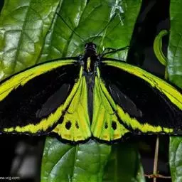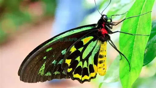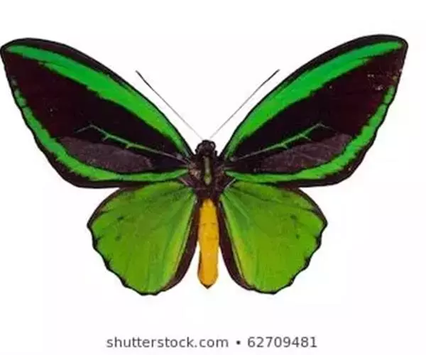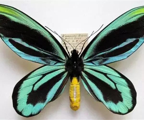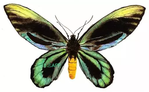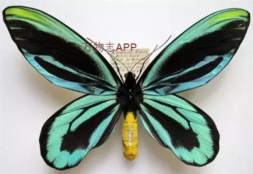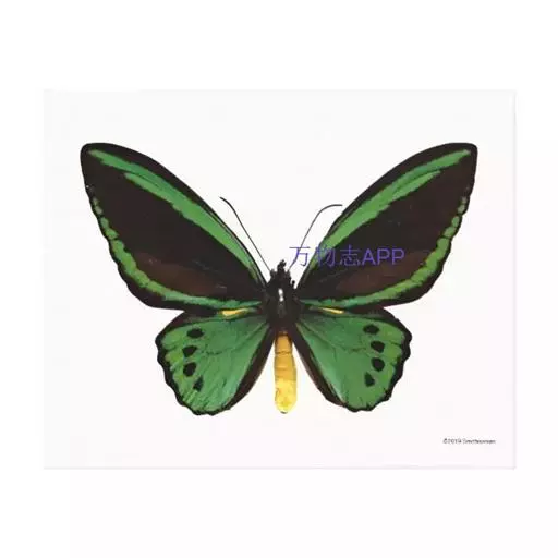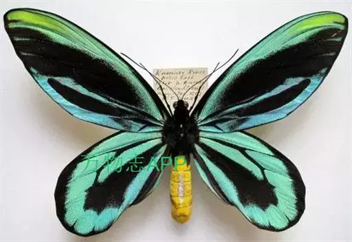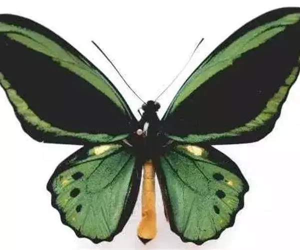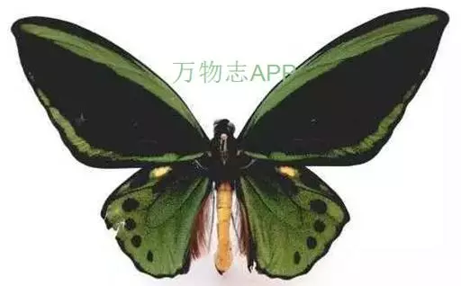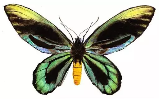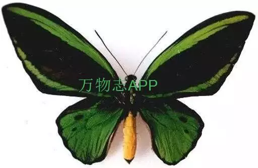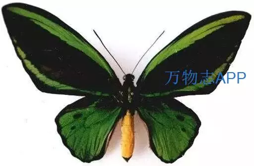 亚历山大鸟翼凤蝶(Ornithoptera alexandrae)雌蝶的翅展达280毫米,是世界上已知的最大的蝴蝶。雄蝶比雌 蝶小很多,但翅膀的花纹和颜色异常诱人。雄蝶后翅反面金黄色,布有黑脉纹,并具绿色色泽。喜在树顶飞翔。此 蝶不能用一般的捕虫网采集,当地土著人用弓箭射伤而捕获之。