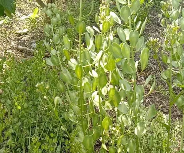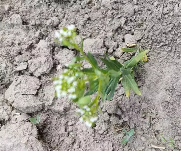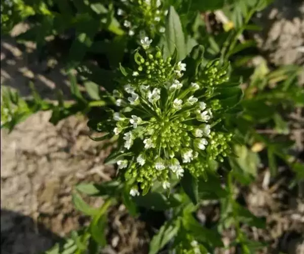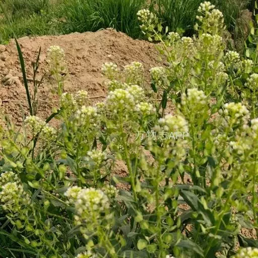 菥蓂(pennycress),一年生草本,高9-60厘米,无毛;茎直立,不分枝或分枝,具棱。基生叶倒卵状长圆形,长3-5厘米,宽1-1.5厘米,顶端圆钝或急尖,基部抱茎,两侧箭形,边缘具疏齿;叶柄长1-3厘米。总状花序顶生;花白色,直径约2毫米;花梗细,长5-10毫米;萼片直立,卵形,长约2毫米,顶端圆钝;花瓣长圆状倒卵形,长2-4毫米,顶端圆钝或微凹。