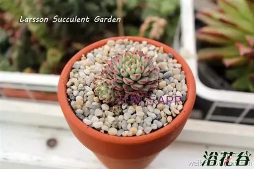 姬莲(Echeveria minima),原产于墨西哥伊达尔戈州等地。姬莲拉丁名的种加词意为“最小的”,中文名称中的“姬”也指的是其娇小的株形。是景天科,拟石莲花属的一种多肉植物。小型种,栽培难度较大。目前国内市场价格很昂贵,是一种观赏价值非常高的景天科多肉植物。 小红衣的小叶片呈莲座状紧密排列,叶片呈微扁的卵形,叶尖两侧有突出的薄翼。强光下,叶缘和叶尖会呈现出漂亮的红色。