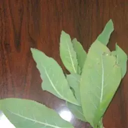 叶大,无柄或有短柄;叶片倒卵形,长圆状椭圆形,椭圆形或长圆状披针形,长10-30厘米,宽4-11厘米,顶端渐尖,基部楔状狭成短柄或无柄而扩大抱茎的宽叶耳,边缘有不规则的锐锯齿,齿端具小尖,侧脉12-30对,弧状弯曲,上面绿色,下面有时变紫色,两面无毛;上部叶渐小,长圆状披针形或披针形,顶端长渐尖或尾尖。