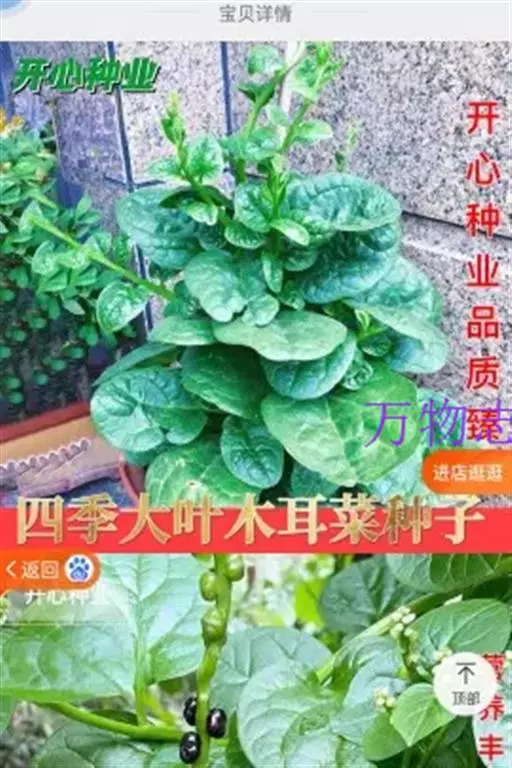 木耳菜 多年生高大草本,高1.5-2米。茎肉质,基部木质,直径1.5-2厘米,下半部平卧,上部直立,有多数伞房状分枝,绿色或带紫色,有明显的槽沟,无毛或上部多少被毛。