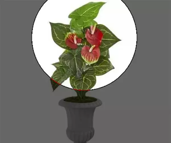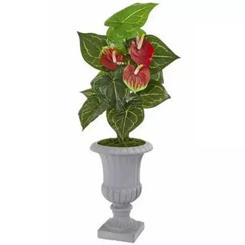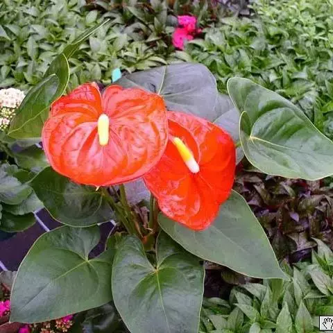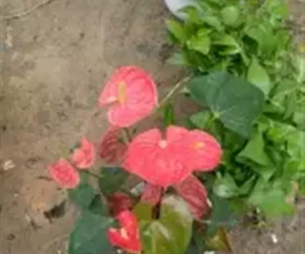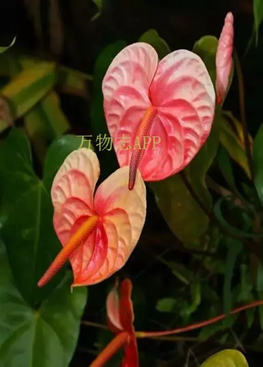 其株高一般为50~80cm,因品种而异。具肉质根,无茎,叶从根茎抽出,具长柄,单生、心形,鲜绿色,叶脉凹陷。花腋生,佛焰苞蜡质,正圆形至卵圆形,鲜红色、橙红肉色、白色,肉穗花序,圆柱状,直立。四季开花。