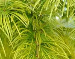 乔木,在原产地高达50米,胸径达2米;树皮暗灰色或暗灰黑色,粗糙,成鳞片状开裂;大枝通常平展,树冠塔形;一年生枝淡灰黄色,凹槽中有细毛或无毛,二、三年生枝淡灰色或淡黄灰色;冬芽卵圆形,有少量树脂。叶条形,直或微弯,长2-3.5厘米,稀达5厘米,宽3-4毫米,近于辐射伸展,或枝条上面的叶向上直伸或斜展,枝条两侧及下面之叶列成两列,先端钝而微凹(幼树之叶在枝上列成两列,先端二裂),上面光绿色,下面有2条灰白色气孔带;横切面上面皮下层细胞二层,外层不连续排列,内层仅有数枚皮下层细胞,两端边缘有一层连续排列的皮下层细胞,下面中部一层,或有数枚疏生的皮下层细胞形成第二层,壮龄树及果枝之叶的树脂道4个(2个中生,2个边生)或仅有2个中生树脂道,幼树之叶有2个边生的树脂道,稍大的树上之叶有2个中生的树脂道。