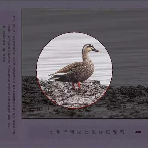斑嘴鸭是雁形目鸭科鸭属鸟类。李文华,旭日干,中国自然资源通典 辽宁卷,内蒙古教育出版社,2015,第361页雄鸟体羽大部棕褐色;嘴蓝黑色,先端黄色,嘴基至耳区贯眼线黑褐色;虹膜黑褐色,外圈橙黄色;眉纹黄白色,头顶、额、枕部暗棕褐色;上背灰褐色,下背褐色;翼镜蓝绿色带紫色金属光泽;胸部棕白色杂褐色斑,腹褐色;腰、尾上覆羽、尾羽黑褐色,尾下覆羽黑色;跗蹠和趾棕黄色,爪黑色。雌鸟嘴端黄斑不明显,下体自胸以下淡白色,杂暗色斑。因嘴端有黄斑而得名。斑嘴鸭分布于中国各省区,栖息于河流、湖泊、水塘及沼泽等湿地中。善游泳、行走,游泳时尾露出水面,除繁殖期外,常成群活动,也和其他鸭类混群。主食植物的种子、嫩芽和幼苗等植物性食物,也食昆虫、软体动物等动物性食物。繁殖期5—7月,以干草和绒羽在岸边草丛中做巢,1年繁殖1窝,每窝产卵8—14枚,孵化期24天。斑嘴鸭被列入中国国家林业局2000年8月1日发布的《国