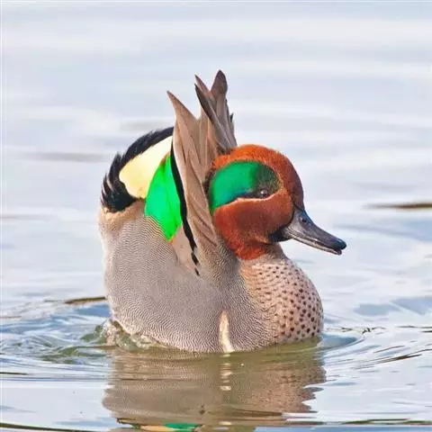 绿翅鸭是小型鸭类,体长37厘米,体重约0.5千克。嘴脚均为黑色。雄鸟头至颈部深栗色,…