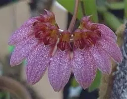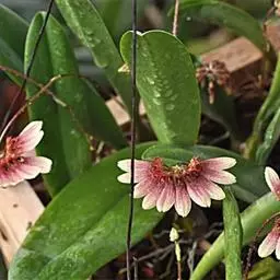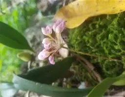 芳香石豆兰(学名:Bulbophyllum ambrosia (Hance) Schltr.):根状茎粗2-3毫米,被覆瓦状鳞片状鞘,每相距3-9厘米生1个假鳞茎。假鳞茎直立或稍弧曲上举,圆柱形顶生1枚叶。叶革质,长圆形。花葶出自假鳞茎基部,1-3个,圆柱形,直立,顶生1朵花;花多少点垂,淡黄色带紫色;花瓣三角形,长约6毫米,中部宽3毫米,先端急尖,具3条脉,边缘全缘;唇瓣近卵形,中部以下对折,基部具凹槽。花期通常2-5月。
