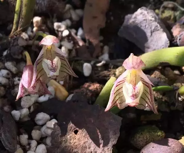 花葶出自假鳞茎基部,1-3个,圆柱形,直立,连同花梗和子房长4-7厘米,顶生1朵花;花序柄长6-8毫米,粗约1毫米,基部具2-4枚紧抱于花序柄的干膜质鞘;花梗和子房长1-1.4厘米;花苞片膜质,卵形,长约3毫米;花多少点垂,淡黄色带紫色;中萼片近长圆形,长约1厘米,中部宽5毫米,先端急尖或锐尖,具5条脉,无毛,边缘全缘;侧萼片斜卵状三角形,与中萼片近等长,中部宽6毫米,中部以上偏侧而扭曲呈喙状,先端稍钝,基部贴生于蕊柱足而形成宽钝的萼囊,具5条脉。