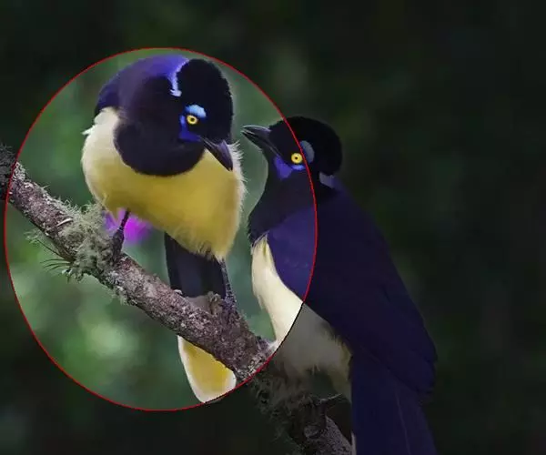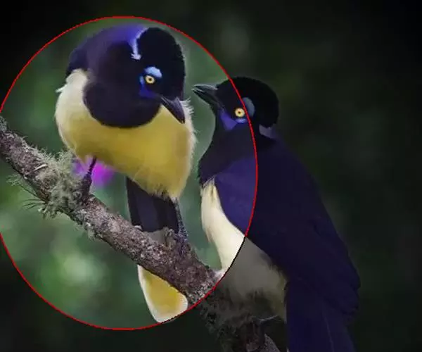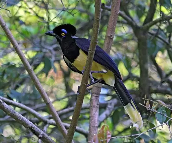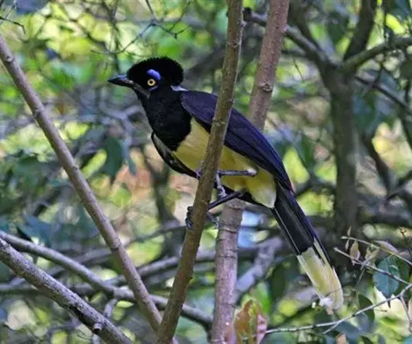 绒冠蓝鸦(学名:Cyanocorax chrysops):雌雄相似,体长35厘米,体重127-170克。具中等长度的鸟喙。平均体重约为157克,外形漂亮,脸部黑色,眼圈金色,眼圈四周有蓝色斑块,头上羽冠黑色如同黑色毡帽戴在头顶,非常醒目,喉部蓝色,下体胸部黑色,腹部黄色,背部蓝黑色,上部和翅上覆羽为暗紫色。尾巴相同,但尾羽终端具有很宽的白色或微黄色羽毛。鸟喙和腿黑色。虹膜柠檬黄或淡黄色。