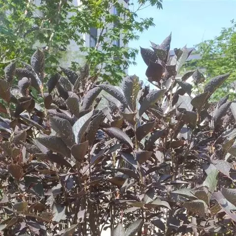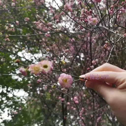 园艺杂交种,由重瓣粉型梅花与红叶李杂交而成。落叶小乔木。叶片卵圆形,长5-9厘米,紫红色,卵状椭圆形。花粉红色,着花繁密,1-2朵着生于长、中及短花枝上,先花后叶,花期春季,花叶同放,花色浅紫,重瓣花,先叶开放,萼筒宽钟状,萼片5枚,近圆形至扁圆,花瓣15-17枚,小瓣5-6梅,花梗1.5厘米,雄蕊多数,自然花期自3月18日第一朵花开以后,逐次自上而下陆续开放至4月中旬。