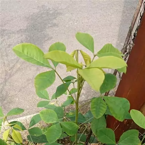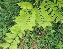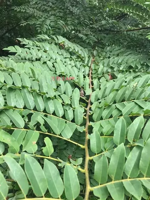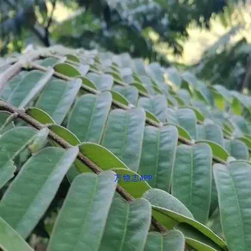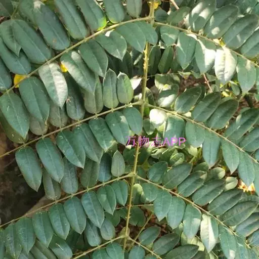 叶长25-45cm;叶柄短,长约3-5cm;叶轴及叶柄多少被黄色微柔毛;小叶薄革质,长圆状披针形,长6-9cm,阔2-3cm,基部圆形,顶端短渐尖或急尖,边全缘,上面无毛,下面有灰白色的糙伏毛;小叶柄长2-3mm。