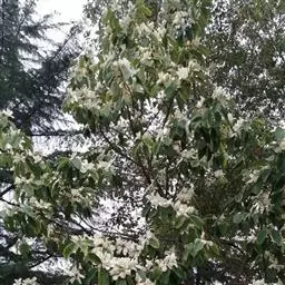 乔木,多分枝,高达10米,树皮灰白色,小枝黑色;芽,嫩枝、叶柄、嫩叶下面、花梗、果梗均被银灰色或红褐色平伏柔毛。