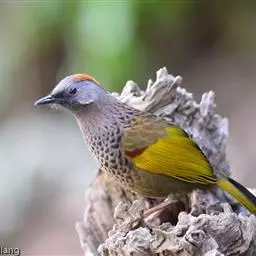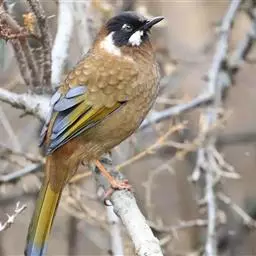 灰翅噪鹛(学名:Garrulax cineraceus)中型鸟类,体长21~25厘米。额黑色,头顶黑或灰色,眼先、脸白色。上体橄榄褐至棕褐色,尾和内侧飞羽具窄的白色端斑和宽阔的黑色亚端斑,外侧初级飞羽外翈蓝灰色或灰色,颧纹黑色。下体多为浅棕色;嘴、脚黄色。
