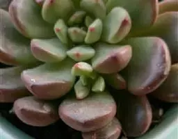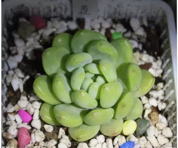 叶匙形,互生,排列成莲座状;表面光洁,正面平坦,背面微微隆起,肉质厚实,翠绿色或嫩绿色,叶面上被白粉,并透出密布的极细微的白色颗粒。在光照充足、温差大的环境下,叶尖会出现美丽可爱的小红点,叶色变为果冻般的浅绿色或黄绿色,犹如凝冻通透、弹吹欲破的玉脂。
