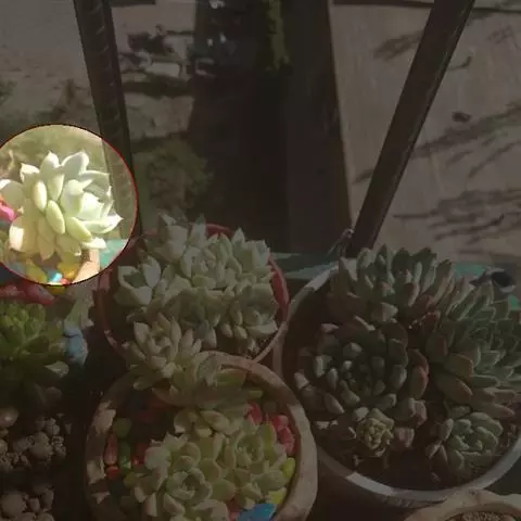 花椿为景天科青锁龙属一种多年生常绿肉质开花植物,茎直立,株高通常15厘米以内,易群生;叶交互对生,抱茎,肉质,叶片内凹像掏空的半球,顶叶互相包裹外观呈球形,叶绿色至褐红色,基部红色,叶缘有密集短毛,叶面有比较密集的深褐红色点;小花白色,钟形,顶端外翻。