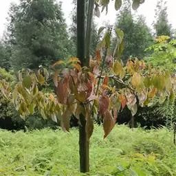 从播种到幼苗形成,土壤温度逐渐上升,种子发芽需要较高温度和较多水分,稍不注意则会导致嫩芽闷死、病死或被虫吃掉。灯台树不耐高温,忌曝晒,苗床应保证足够的水分,可用稻草覆盖床面保湿保温,同时对幼苗适当遮荫,防止出现日灼。秋播和随采随播的种子出苗早,要防止晚霜冻害。在苗木大量生长期间,中耕、除草、追肥三者要结合进行,同时保证土壤水分和空气湿度,促进苗木茁壮生长。幼苗木质化期间,应追施钾肥,促进苗木木质化,切忌氨肥过多,致使苗木贪长,顶端不能木质化越冬。一年生苗应长至60-90 cm高,翌年春季即可进行移栽并按需培育大苗用于园林绿化。