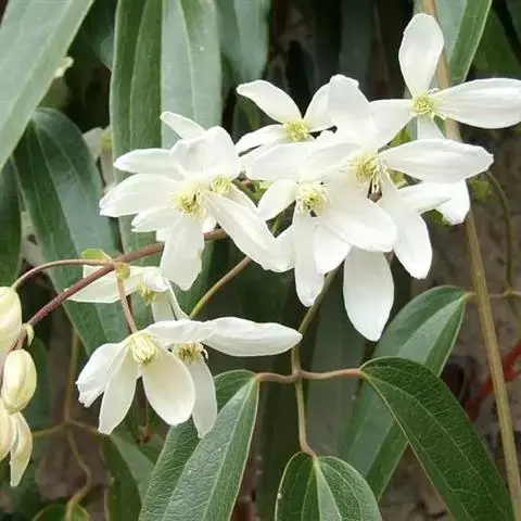 须根红褐色密集,茎攀援圆柱形,表面棕黑色或暗红色,有明显的条纵纹,羽状复叶;小叶片纸质,卵圆形或卵状披针形,顶端渐尖或钝尖,基部常圆形,边缘全缘,有淡黄色开展的睫毛,小叶柄常扭曲,单花顶生;花梗直而粗壮,被淡黄色柔毛,无苞片;花大,直径可达14厘米;萼片白色或淡黄色,倒卵圆形或匙形,顶端圆形,基部渐狭,花丝线形,短于花药,花药黄色,子房狭卵形,花柱上部被短柔毛。瘦果卵形,5月至6月开花,6月至7月结果。