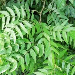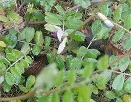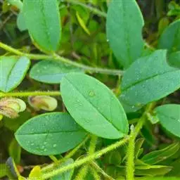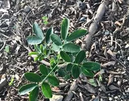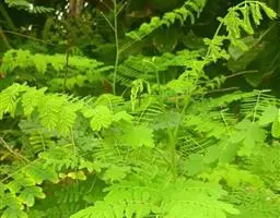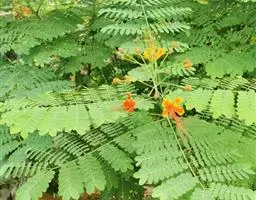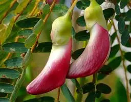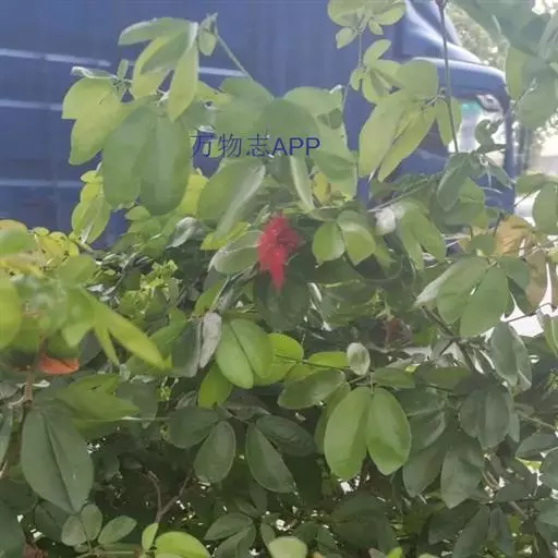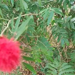 红粉扑花 半落叶灌木,高1-2米;枝条扩展,小枝圆柱形,褐色,粗糙。托叶卵状披针形,宿存。二回羽状复叶(互生),具有1对羽片,而其小叶只有1对,其形状如肾脏形。边缘被疏柔毛;中脉略偏上缘;小叶柄长仅1毫米。总叶柄长1-2.5厘米;羽片1对,长8-13厘米。