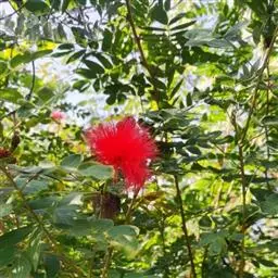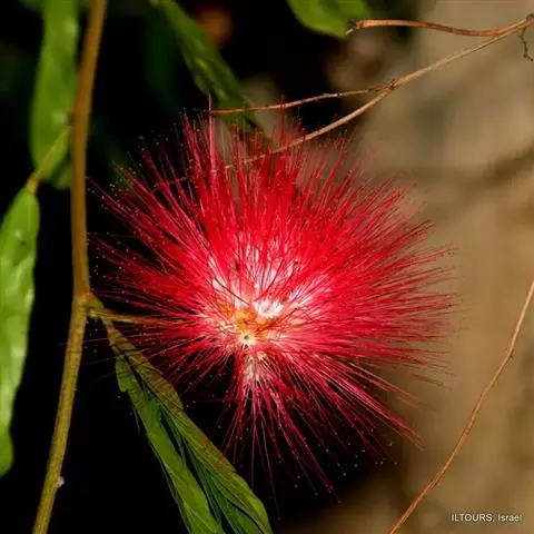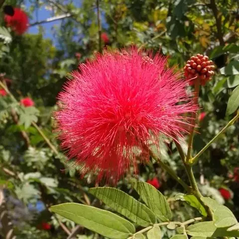红粉扑花在正午或晚上时,其叶子和花朵均会闭合起来。盛开的花朵其头状花序腋生,有密集且细长的花丝聚合而成“束状”,颜色为鲜红色(花期最长为11个月)。
