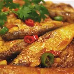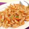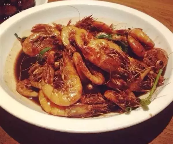 此菜酱红色,虾外脆内嫩,带着咸鲜味。