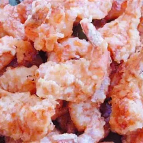2、炒锅下色拉油,旺火烧至220度时,将虾入锅,用手勺不断推动,约炸30秒钟用漏勺捞起,待油温回升200度左右时,将虾倒入复炸10秒钟,使肉与壳脱开,用漏勺捞出。