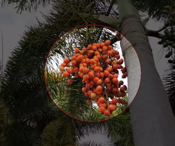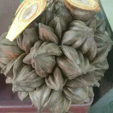 雌雄同株。粉红色穗状花序,分枝多,长于包茎底下。花单性,常3朵一组,中央为雌花,两侧为雄花,雄花有雄蕊60-71枚;雌花子房具3心皮、1室,具1胚珠。果椭圆形至卵圆形,长约6厘米,直径约3.5厘米,熟时橙红色。种子一枚,橄榄状椭圆形,表面有花纹,内果具有很多粗而硬的如浮雕般镶嵌在果核上的纤维,胚乳均匀,千粒重约20千克。