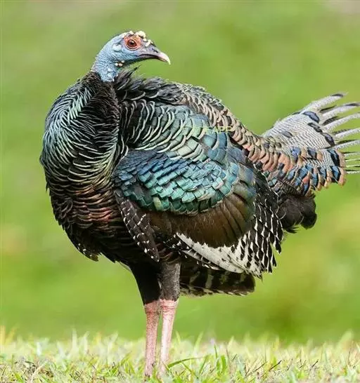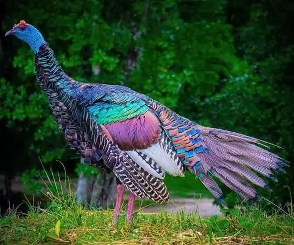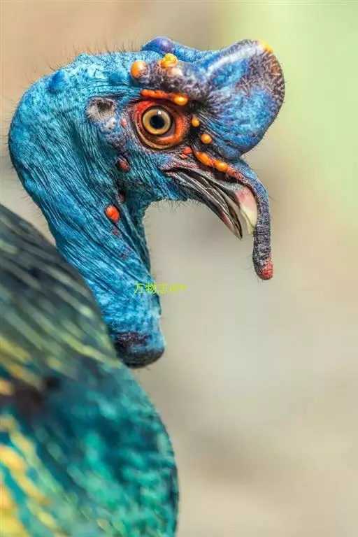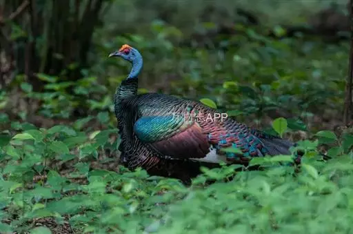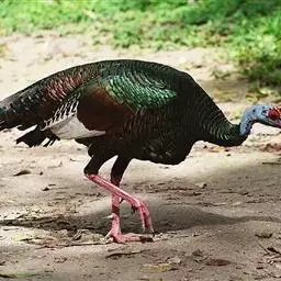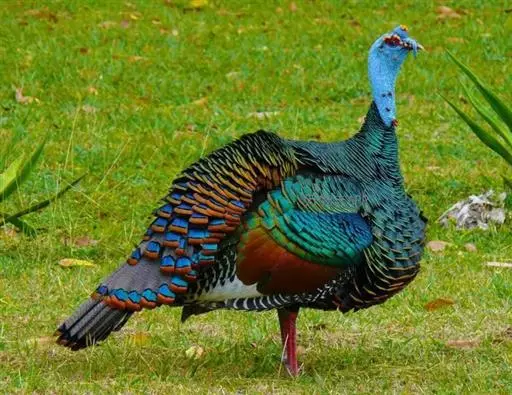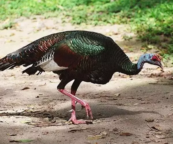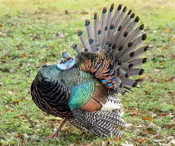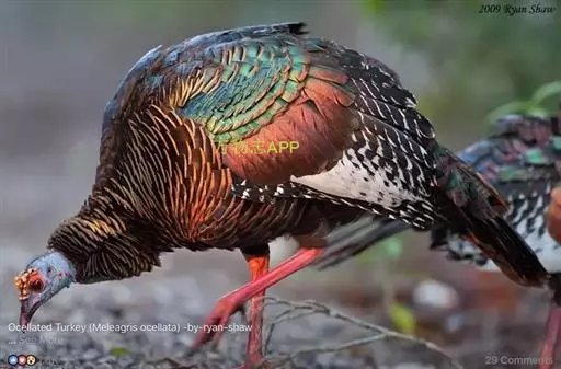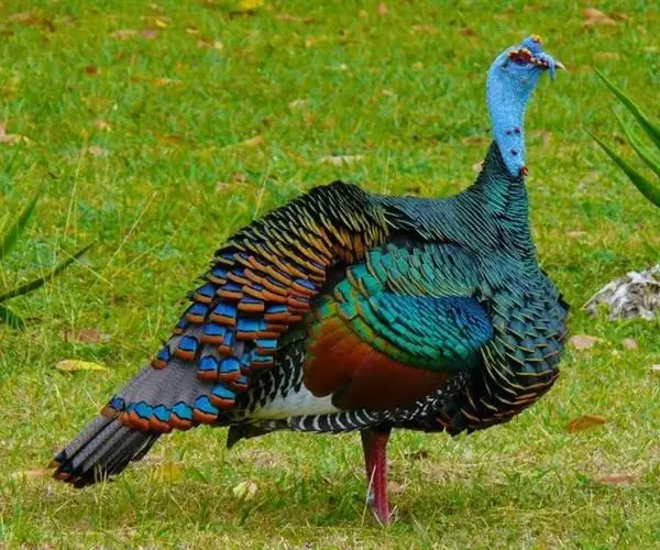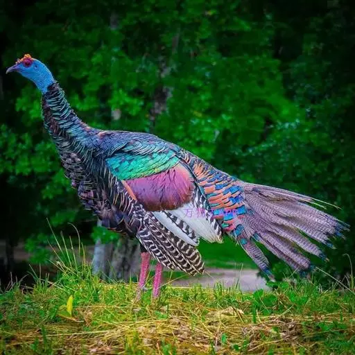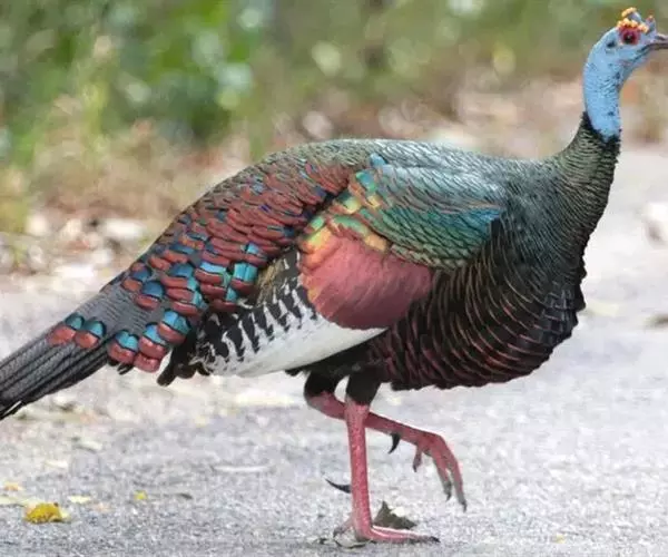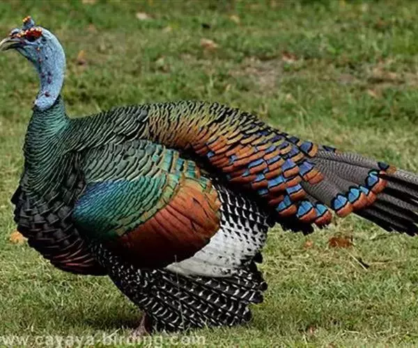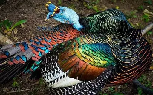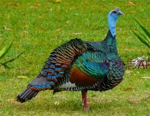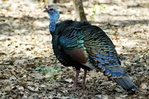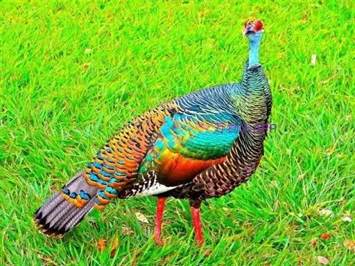 眼斑吐绶鸡(学名:Ocellated Turkey):是火鸡科的两种鸟类之一。体型比普通火鸡略小些,体长1米左右,体重2.4-5.4千克,雄性比雌性略大,长得很特别,蓝色的秃脑袋上冒出几个橙黄色的疙瘩。但是它羽色艳丽,身体呈铜色及绿色。虽然雌鸡较深及绿色,胸部羽毛与雄鸡相似。它们的尾部覆盖看一些眼状的斑点。眼斑吐绶鸡的名字就是这样来的。
