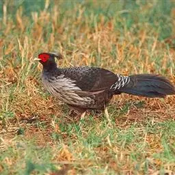 白颈长尾雉:大型鸡类,体长81厘米,体型大小和雉鸡相似。雄鸟头灰褐色,颈白色,脸鲜红色,其上后缘有…