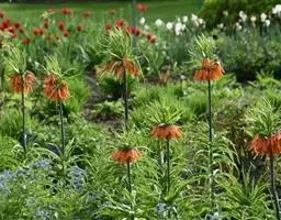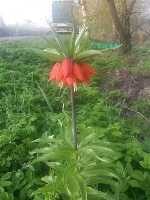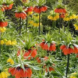 皇冠贝母(学名:Fritillaria imperialis L.)是百合科贝母属多年生直立粗壮草本植物,株高50-100厘米,地下具肥厚鳞茎,直径15-20厘米。叶片散生,披针形,长15厘米。花数朵轮生于花葶上端,于叶状苞片群下,花冠钟形,下垂,长约6厘米,花被片6,红色、橙色、黄色。花期4-5月。