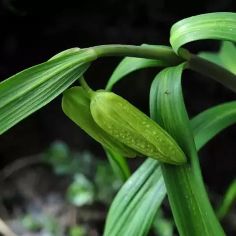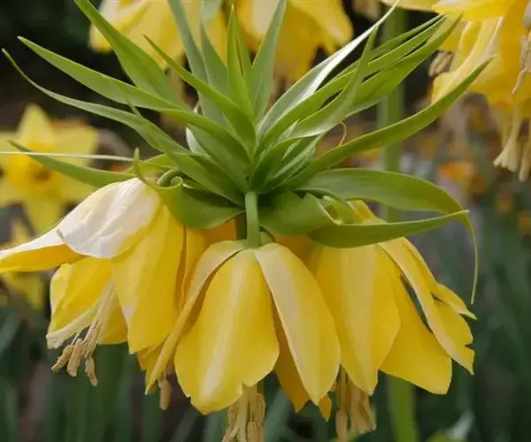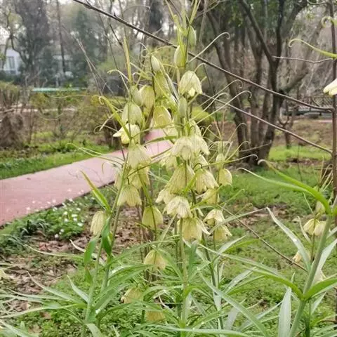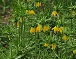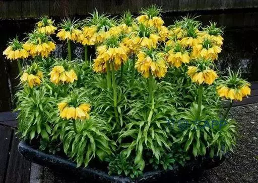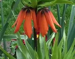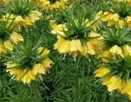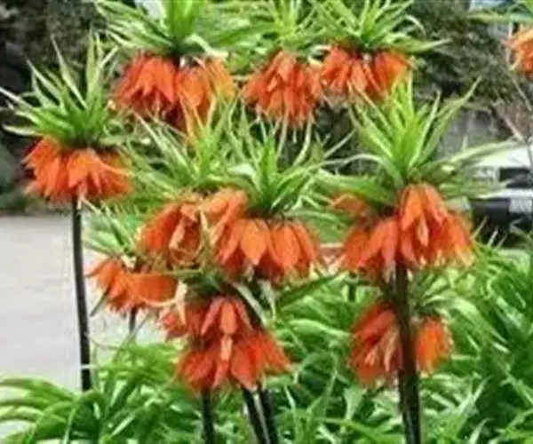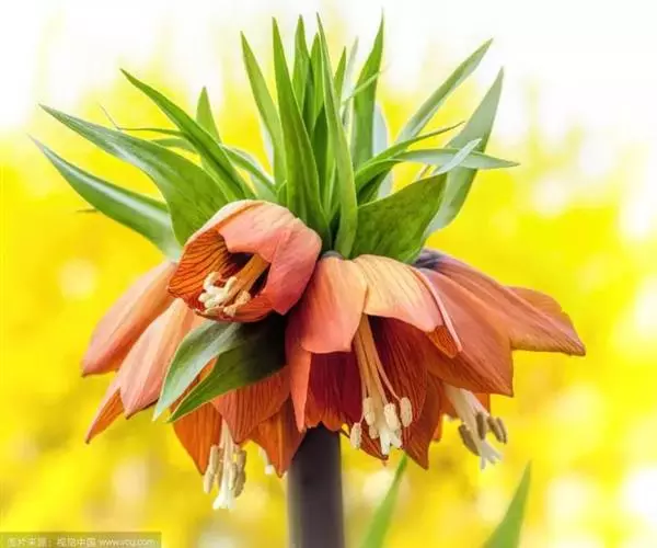 皇冠贝母为多年生直立粗壮草本植物,园艺栽培上属秋植球根。地下鳞茎由2-3片肥厚的肉质外鳞片组成,有臭味。通常开花鳞茎的周径需达到20-24厘米以上,大的种球能达30厘米以上,单球重120-150克左右。在外鳞片内,有数个由肉质鳞片包裹的花芽。初春鳞茎萌芽后,长出基生叶,基生叶轮状丛生,约40-50片。茎顶抽出花茎,高70-120厘米。花茎顶端,在顶生叶叶腋间着生小花。小花5-10朵,聚生于花茎顶部,形成-个顶生花盘,花盘冠幅直径可达25-30厘米,形态壮观。小花钟状下垂,花被内面基部有白色珍珠状蜜腺。花后结蒴果,三室,约有种子80粒左右。