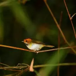 棕脸鹟莺:体长10厘米,是一种色彩亮丽而有特色的莺鸟。头栗色,具黑色侧冠纹。上体绿,腰黄色。下体白,…