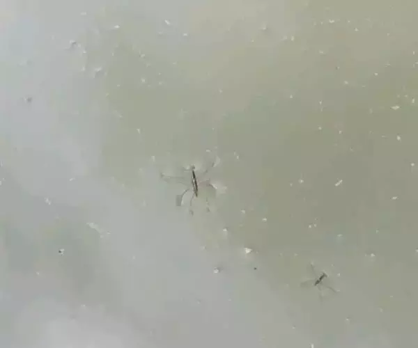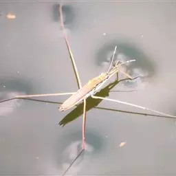 水黾是一种在湖水、池塘、水田和湿地中常见的小型水生昆虫。水黾科昆虫成虫长8至20mm,黑褐色,头部为三角形,稍长。体小 水黾 型至大型,长形或椭圆形。 口吻稍长,分为3节,第2节最长;触角丝状,4节,突出于头的前方。前胸延长,背面多为暗色而无光泽,无鲜明的花斑,前翅革质,无膜质部。身体腹面覆有一层极为细密的银白色短毛,外观呈银白色丝绒状,具有拒水作用。 其躯干与宽黾蝽科类似。它们的躯干非常瘦长,躯干上被极细的毛,这些毛厌水。腹部具明显的侧接缘。