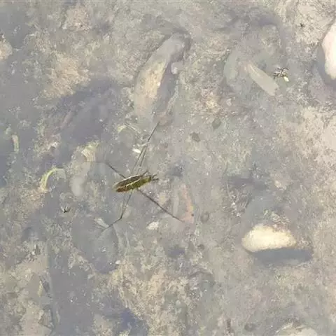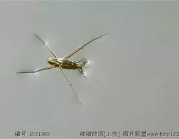 水黾是水生半翅目类昆虫,黾蝽科,学名Aquarium paludum Fabricius,栖息于静水面或溪流缓流水面上。身体细长,非常轻盈;前脚短,可以用来捕捉猎物;中脚和后脚很细长,长着具有油质的细毛,具有防水作用。体色黑褐色,体长约22mm,也能够在陆地上生活一段时间。