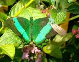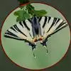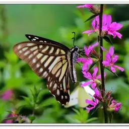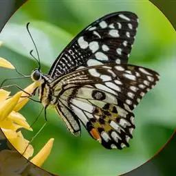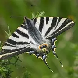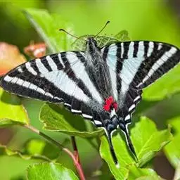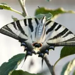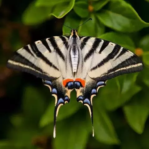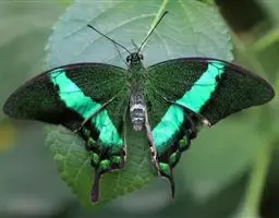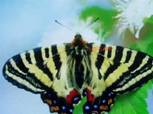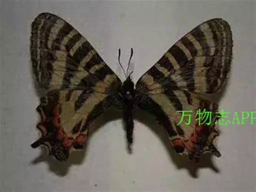虎凤蝶模式种翼展为3.0-3.5厘米,翅面黄色,有黑色斑纹,翅脉黑色。底部是一个倒置的副本,颜色更为明亮。前翅外缘有宽的黑带,翅面有很多黑色短纹,犹如虎皮,故名。后翅黄色,有一长一短的黑色条纹,外缘波形,黑带上镶有四个弯月形黄斑,黑带的中间嵌有蓝色斑点,最里面一列弯月形红斑。在黄色衬底的前翅上,自前缘向后翅延射着八道如虎斑的粗黑条纹,后翅外缘呈锯齿状。雌蝶比雄蝶略暗。