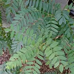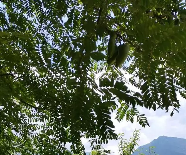 落叶乔木,无刺,高达5-12米;树皮灰褐色,具明显的白色皮孔;当年生小枝被锈色或白色短柔毛,后变光滑无毛。二回偶数羽状复叶长20-25厘米,无托叶;叶轴具槽,被短柔毛;羽片对生、近对生或互生,5-10对;小叶互生,8-12对,几无柄,具钻形的小托叶,小叶片长圆形,长2.5-5厘米,宽1-1.5厘米,两端圆钝,先端有时微凹,基部稍斜,两面被绢质柔毛。总状花序顶生,被短柔毛;花杂性,白色或带紫色,有长梗,下垂;苞片小或消失;花托深凹,长5-6毫米,被短柔毛;萼片钻形,较花托稍短;花瓣长圆形,先端钝,较萼片稍长,被硬毛;花丝被柔毛;子房无毛,不具柄,有4颗胚珠,花柱粗短,柱头头状。英果长圆形,长7-10厘米,宽3-4厘米,扁平或膨胀,无毛,顶端有短喙,有种子2-4颗;种子近球形而稍扁,直径约2厘米,黑色,平滑无毛。8月间结果。