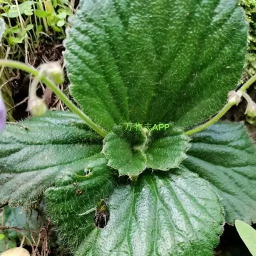 多年生草本。叶全部基生,莲座状,无柄,近圆形,圆卵形,卵形,长1.8-7厘米,宽1.2-5.5厘米,上面被白色贴伏长柔毛,下面被白色或淡褐色贴伏长绒毛,顶端圆形,边缘具牙齿或波状浅齿,叶脉不明显。